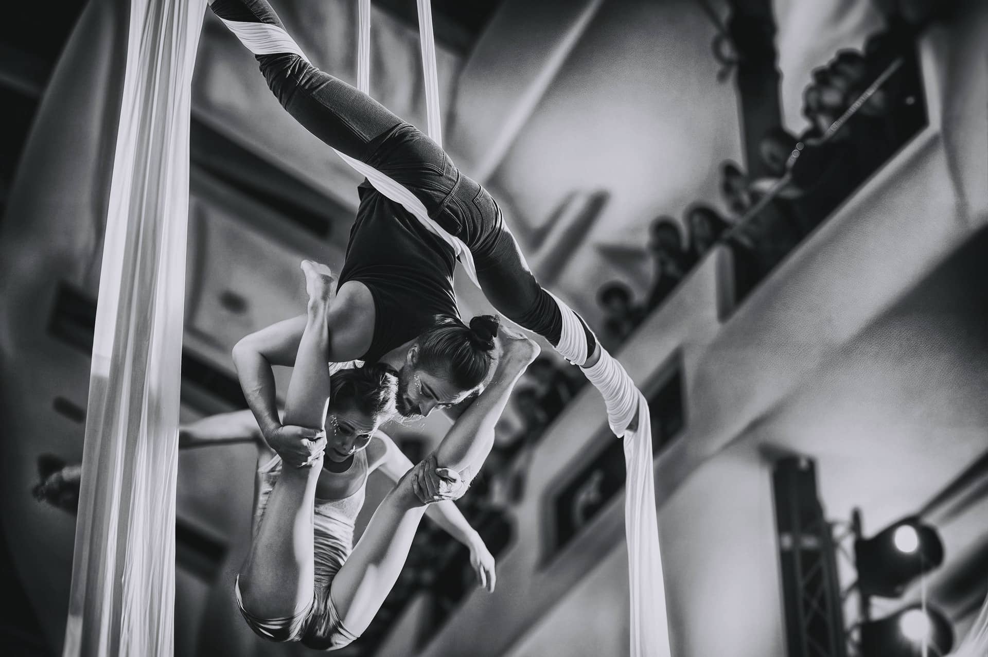 Vystoupení na šále je ideální v prostorách, které mají vysoké stropy, akrobatická show na kruhu, v síti a v hamace se vejde téměř všude. Pokud vám jeden akrobat nestačí, nevadí! Čím více akrobatů, tím větší zábava! Připravíme vám duo synchro na dvou šálách nebo vystoupení v páru, tady se nejvíc osvědčuje spojení muž a žena na jedné šále. Pokud stojíte o vystoupení závěsné akrobacie, ale nemáme k dispozici závěsný bod, nevadí! Využijte mojí konstrukci! Všechna vystoupení trvají do 5ti minut.